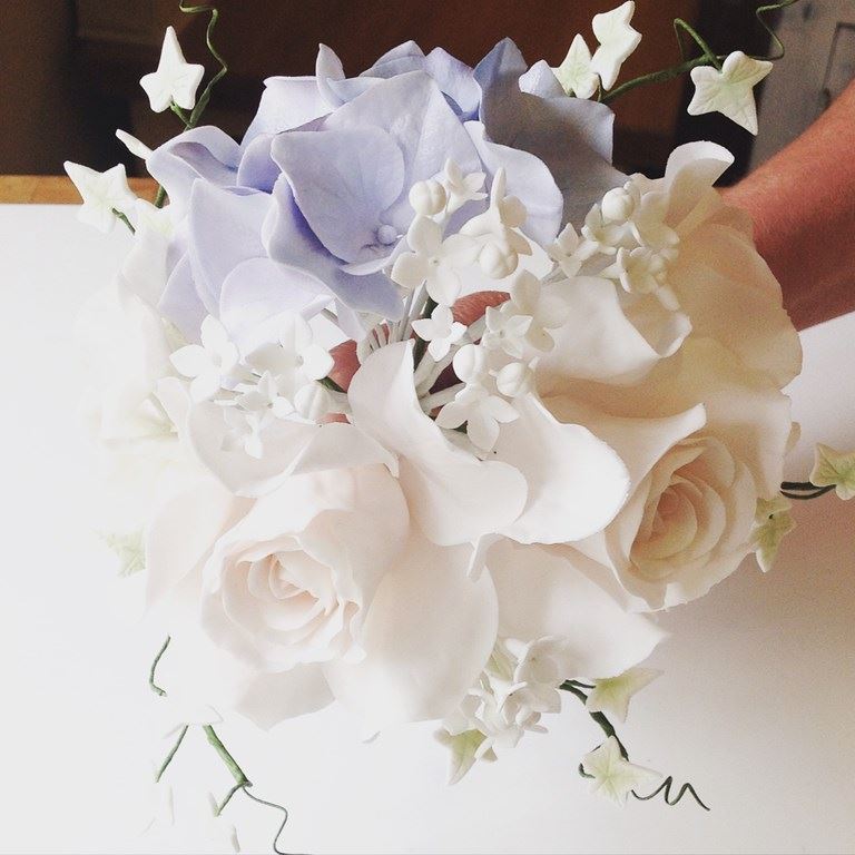 This Sugar floral bouquet is just one of the many floral wedding cake displays assembled with us, and the Blue Hydrangea's, and Roses were created with us during another Private one to one Class! Student then created White Hydrangea's at home!